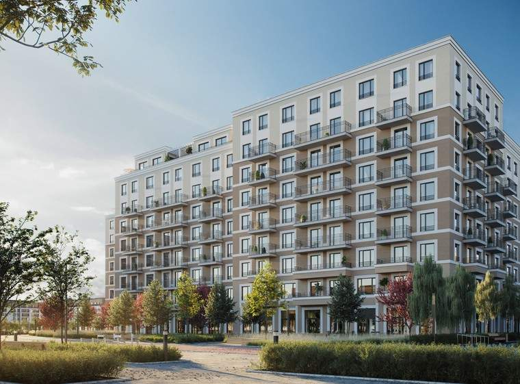 Первая очередь строительства состоит из двух секционных домов г-образной формы 7-9 этажей, которые образуют квартал. Фасады облицованы керамическим кирпичом и архитектурным текстурированным бетоном. Первые этажи высокие и оформлены прозрачным панорамным остеклением со стороны улицы. Дома не выглядят монолитными и тяжеловесными.